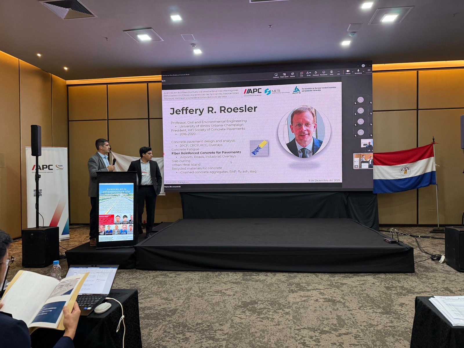 El Dr. Jeffery Roesler, experto en ingeniería de pavimentos, presentó una conferencia magistral sobre los Beneficios y Aplicaciones del Refuerzo con Fibras en Pavimentos de Hormigón. Su exposición se centró en la innovación que permite diseñar estructuras más resilientes, con particular énfasis en la posibilidad de construir losas de concreto sin juntas (Jointless Concrete Slabs), una meta clave para la durabilidad.